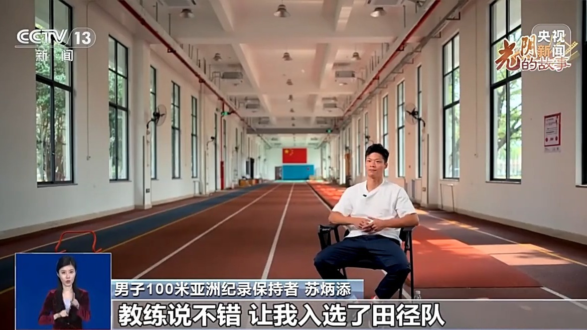 男子100米亚洲纪录保持者 苏炳添:我记得他画了一条线,就像立定跳远。我一跳就跳过去了,教练说不错,让我入选了田径队。但是当时老师不知道我练什么,他就觉得我有运动天分。我跟他练的时候,大概练了一个星期的长跑,没跑下来。后来想一想,他说100米没人练,你去跑一个100米。