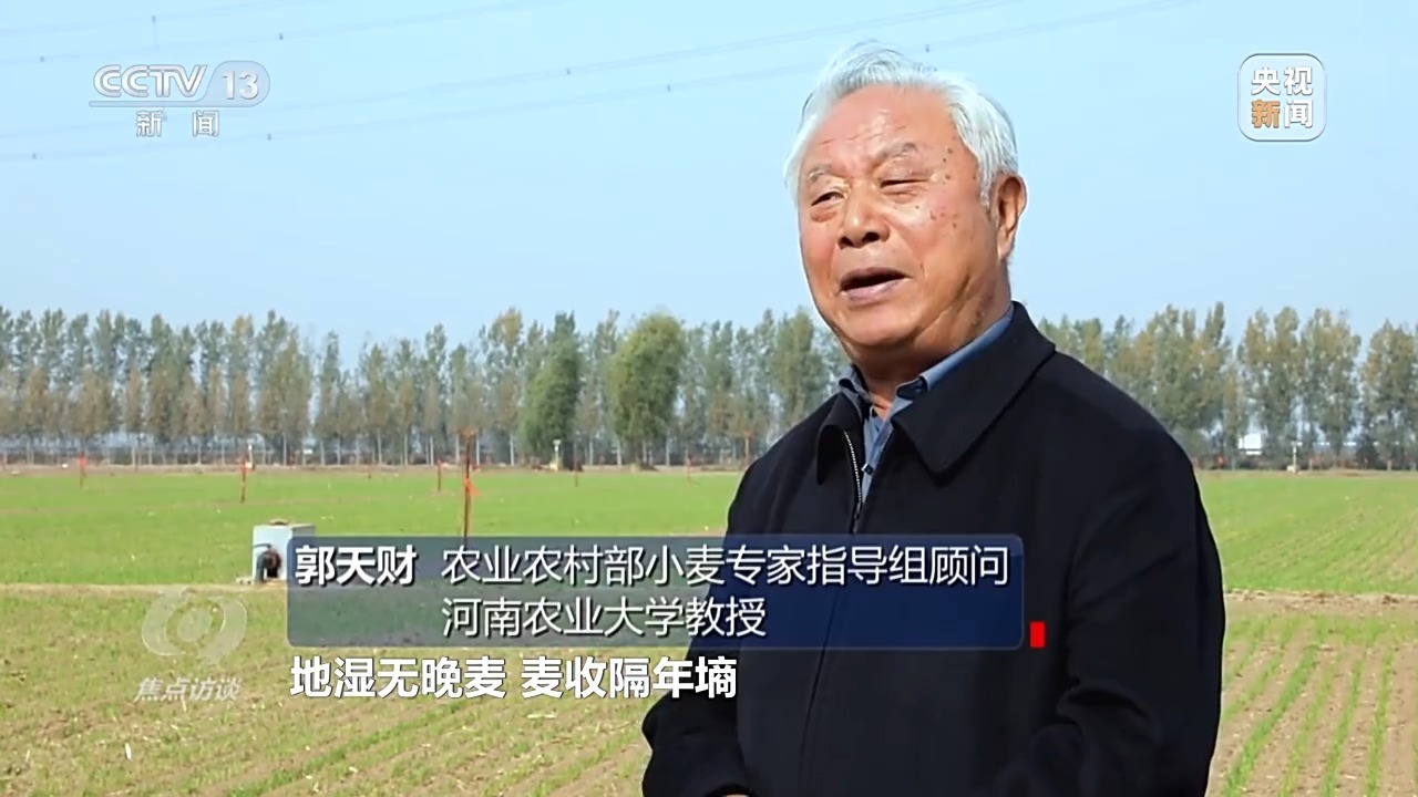 郭天财:小麦大面积晚播,但是雨水又补充了土壤墒情,河南有句农谚,地湿无晚麦,麦收隔年墒,麦种泥窝窝,来年吃馍馍。这就说明了底墒的重要性,根据我从事小麦研究50年的经验,哪一年的底墒好,第二年往往是丰收年。培育冬天壮苗,抓好春季和后期两个管理的关键时期,这样才能实现小麦的丰产高效。