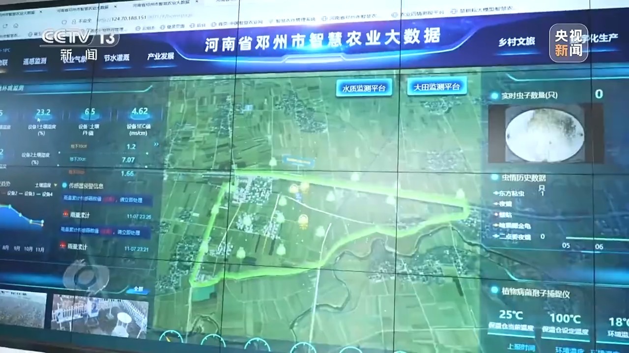 在邓州的智慧农业中心,记者看到,智慧平台正实时监控田地的湿度、温度等情况。