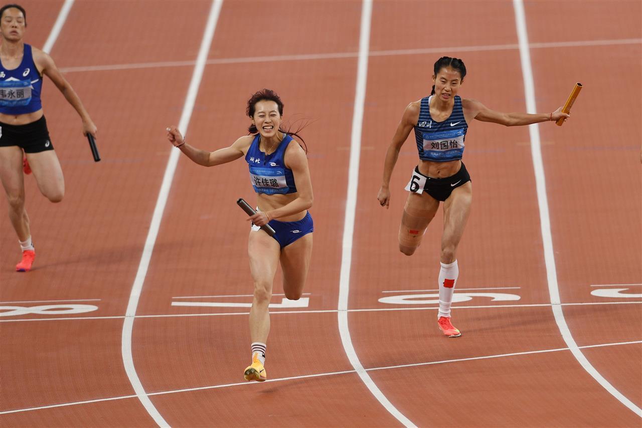决赛发令枪清脆响起,身处第7道的湖北队第一棒选手谢馥蔚反应迅速,凭借出色的爆发力在起跑后30米便占据微弱优势。多支队伍的差距胶着在毫厘之间,看台上观众的欢呼声此起彼伏。作为接力赛的精髓,交接棒的默契程度直接决定胜负走向,湖北队第二棒李贺接棒动作行云流水,接棒后立刻提速,将微弱优势进一步扩大。