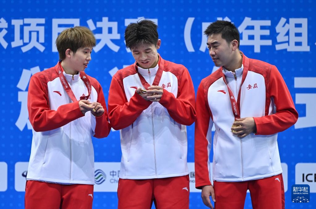 11月20日,冠军安徽队组合刘阳(下左)/刘毅(下右)、亚军浙江队组合王昶(上左二)/谢浩南(上左三)、季军北京队组合刘雨辰(上右二)/冯彦哲(上右三)和教练在颁奖仪式上合影。