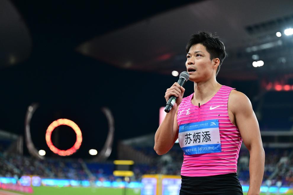 11月20日,广东队选手苏炳添在比赛后发表感言。新华社记者 江汉 摄