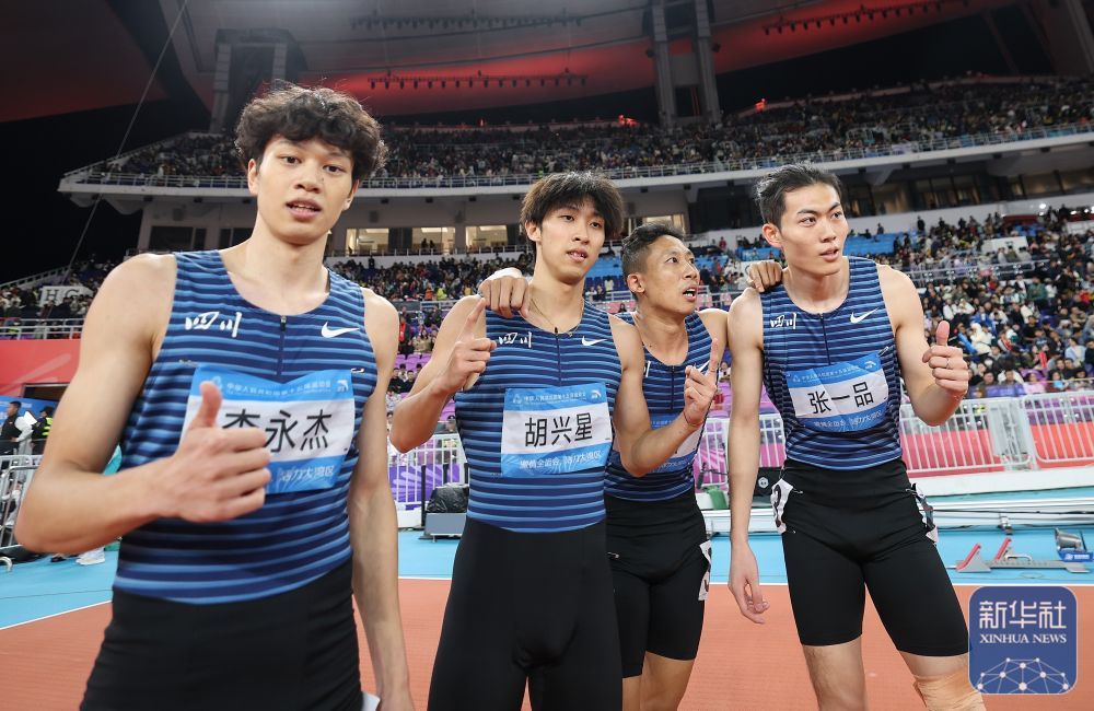 ↑ 四川队选手张一品(左)在冲线后庆祝。 新华社记者 黄伟 摄