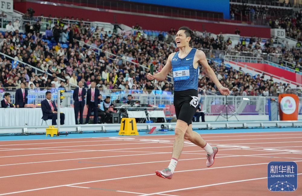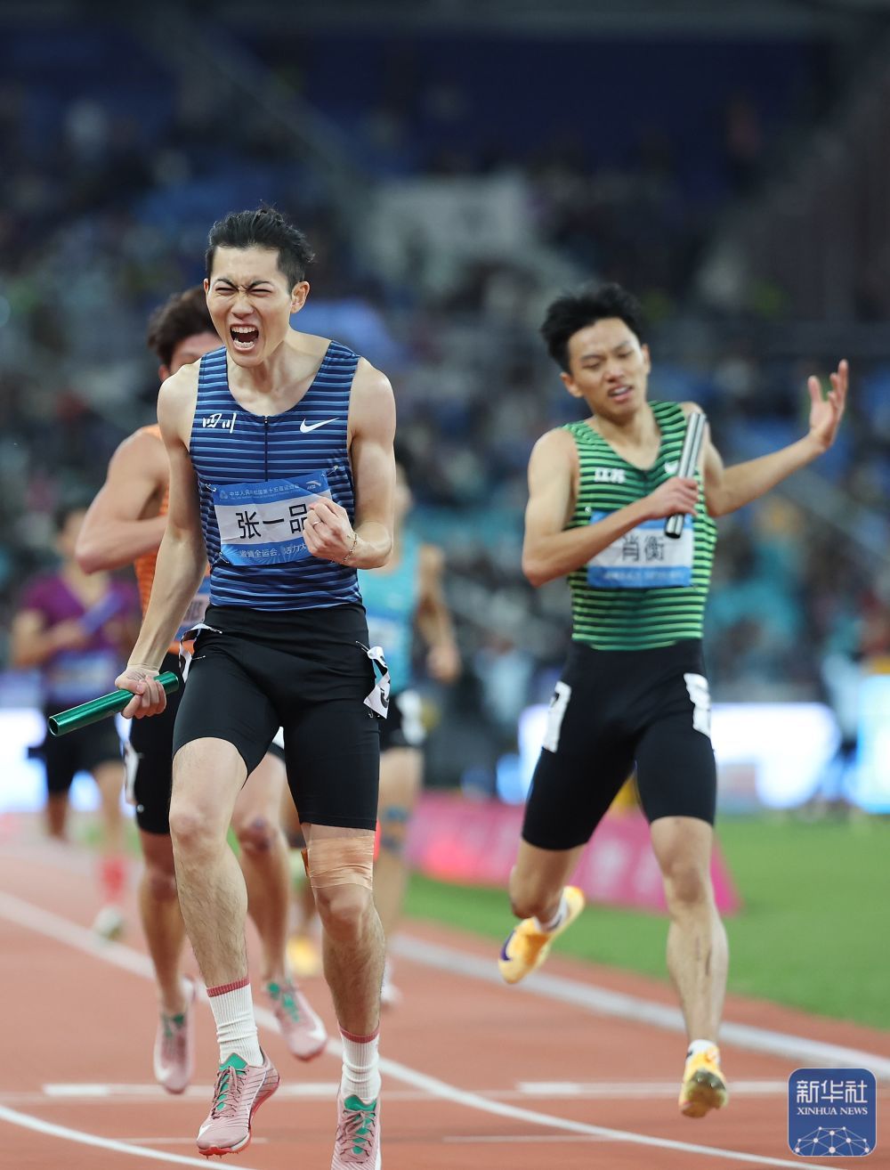 ↑ 四川队选手张一品(前)在冲线后庆祝。 新华社记者 邓华 摄