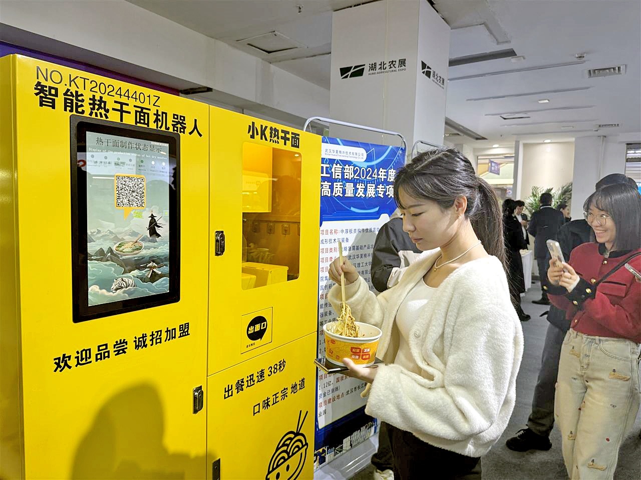 楚天都市报极目新闻讯(记者林楚晗 胡长幸 通讯员黄宣)11月20日,2025武汉(汉口北)商品交易会开幕。在荆楚优品展厅,观展市民在一台名叫“小K”的黄色机器人前排起长队。这台占地不到1平方米的智能设备,是全国首款智能热干面机器人,它因出餐快、口感好、全程无人接触,成为本届汉交会“顶流”。