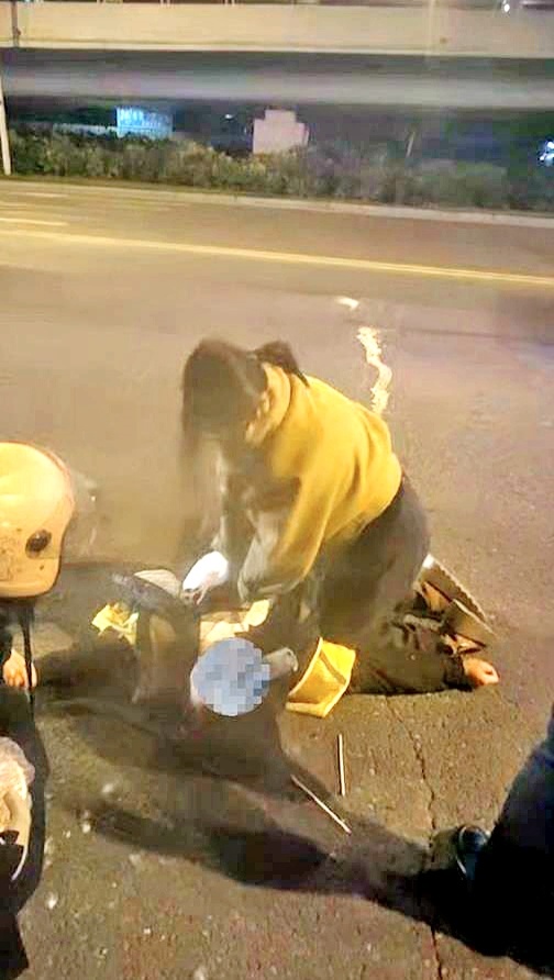 11月18日晚,荆门市城区象山大道天鹅广场路段高架桥下,一辆私家车与外卖骑手电动自行车发生碰撞,骑手倒地不起。正途经此处的谢小婷发现后,立即让丈夫停车,快步冲向现场。