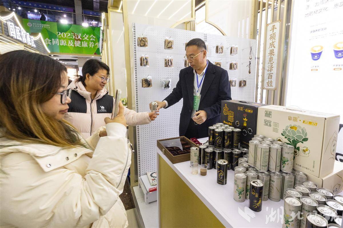 图为汉交会药食同源展区,参观者品尝人参咖啡。