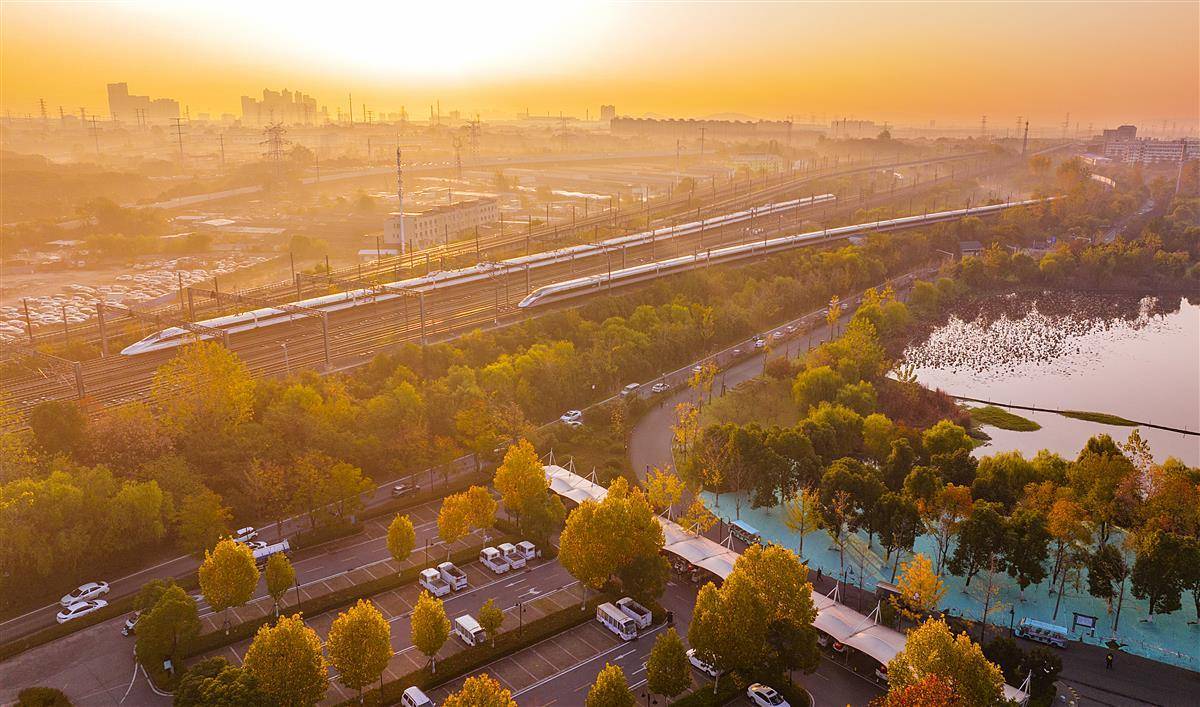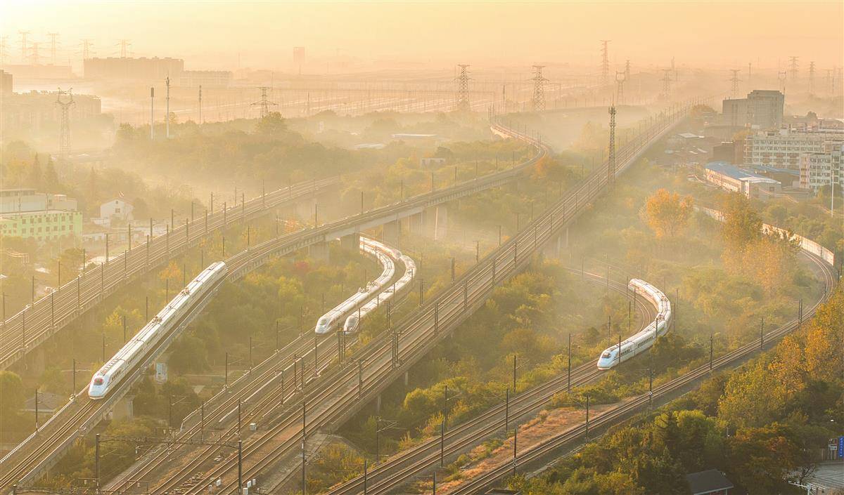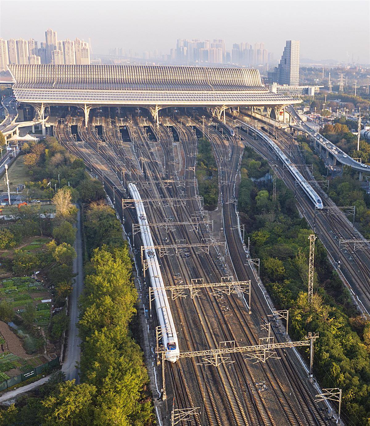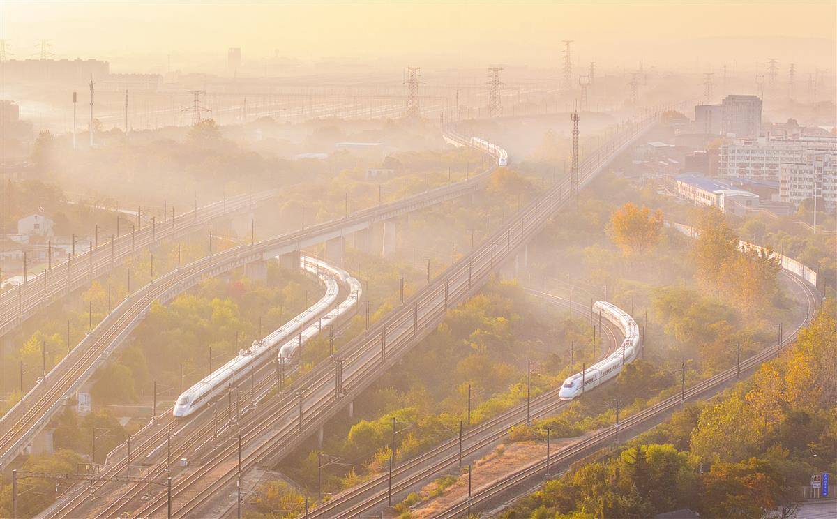 11月21日清晨,笼罩在薄薄晨雾中的武汉站一派繁忙景象,甚至有4列高铁列车同时进出站的震撼场景。武汉站是中国第一个上部大型建筑与下部桥梁共同作用的新型结构火车站,实现了高速铁路、地铁、公路三者的无缝衔接。(湖北日报全媒记者 朱熙勇