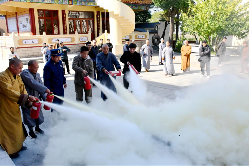 疏散演练结束后,消防宣传员在指定安全区域,现场重点讲解了干粉灭火器的构造、原理及“提、拔、握、压”四字使用口诀,并进行了标准示范。在宣讲员的悉心指导下,僧职员工及寺院安保人员踊跃参与,轮流拿起灭火器进行油盆灭火实操,亲身体验了扑救初起火灾的过程。大家纷纷表示,通过这种“理论+实操”的沉浸式培训,真正学到了“真本领”,收获满满,对今后的消防安全工作更有底气。