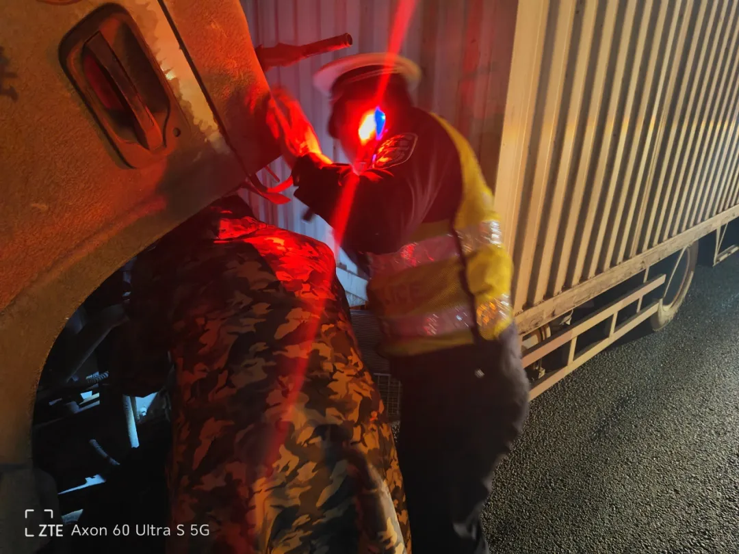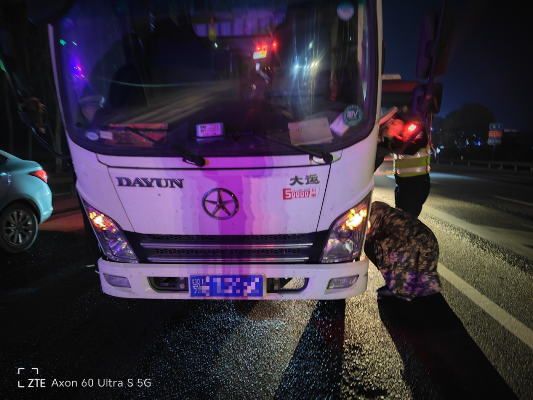 当晚20时45分,义堂中队民警、辅警在316国道倒店红绿灯路口巡逻时,发现一辆鄂KZ59**货车停在道路中央,双闪灯急促闪烁,司机杨某在一旁焦急踱步。过往车辆纷纷避让,现场存在极大安全隐患。