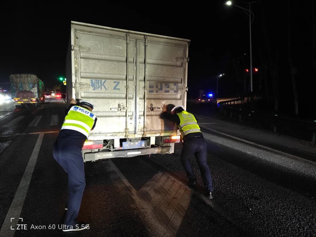 11月20日晚,云梦县公安局交通管理大队义堂中队民警在巡逻途中,及时帮助一辆抛锚货车排除故障,赢得司机和群众的一致好评。