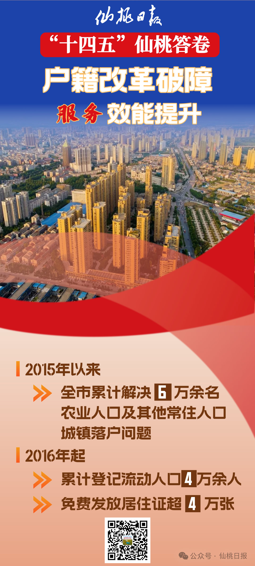 2015年以来,仙桃全市累计解决6万余名农业人口及其他常住人口城镇落户问题。2016年起,全面推行居住登记制度,累计登记流动人口4万余人,免费发放居住证超4万张,持证人可平等享受子女教育、医疗保障等9项公共服务及7项便利措施。通过落实“一次性告知”“一次办成”制度,深化“互联网+户政”改革,147项高频户籍业务实现“一网通办”,年均线上解答群众咨询2000余人次、办理业务1500余笔,让数据多跑路、群众少跑腿。
