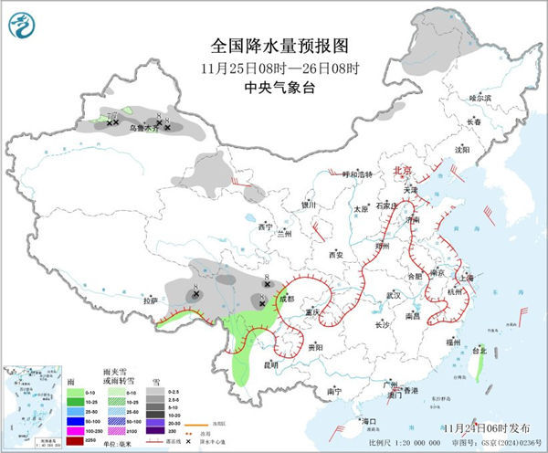 进入11月下旬,影响我国的冷空气较为频繁。目前,一股较强冷空气正自西向东影响我国,今明天(11月24日至25日),冷空气继续东移南下,东北、华北东部到华南等地都将出现降温。紧接着,25日至27日,又将有新一股冷空气影响我国。此外,我国西南地区、东北等地雨雪天气频繁,局地或现大雪。