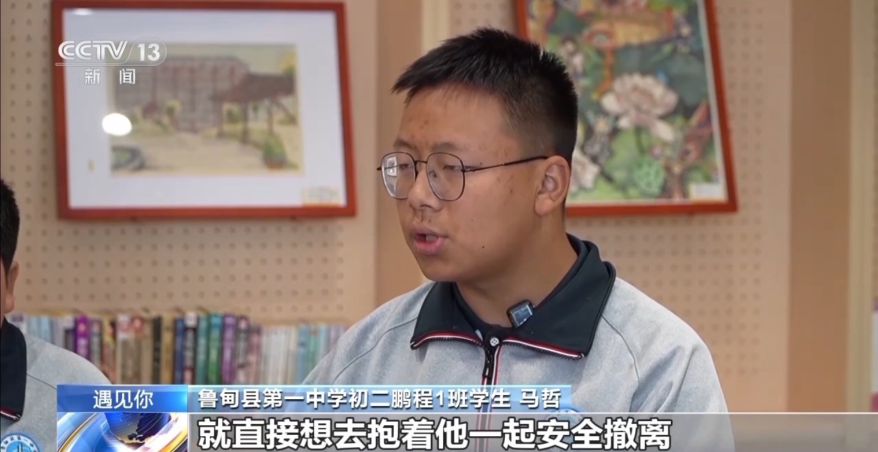 在初二鹏程1班,第一波震感过后,老师迅速引导大家往空旷地点疏散。然而,当所有人都在往教室外撤离时,学生马哲却没有马上走开,他看向双腿行动不便的同桌——马敏欧。