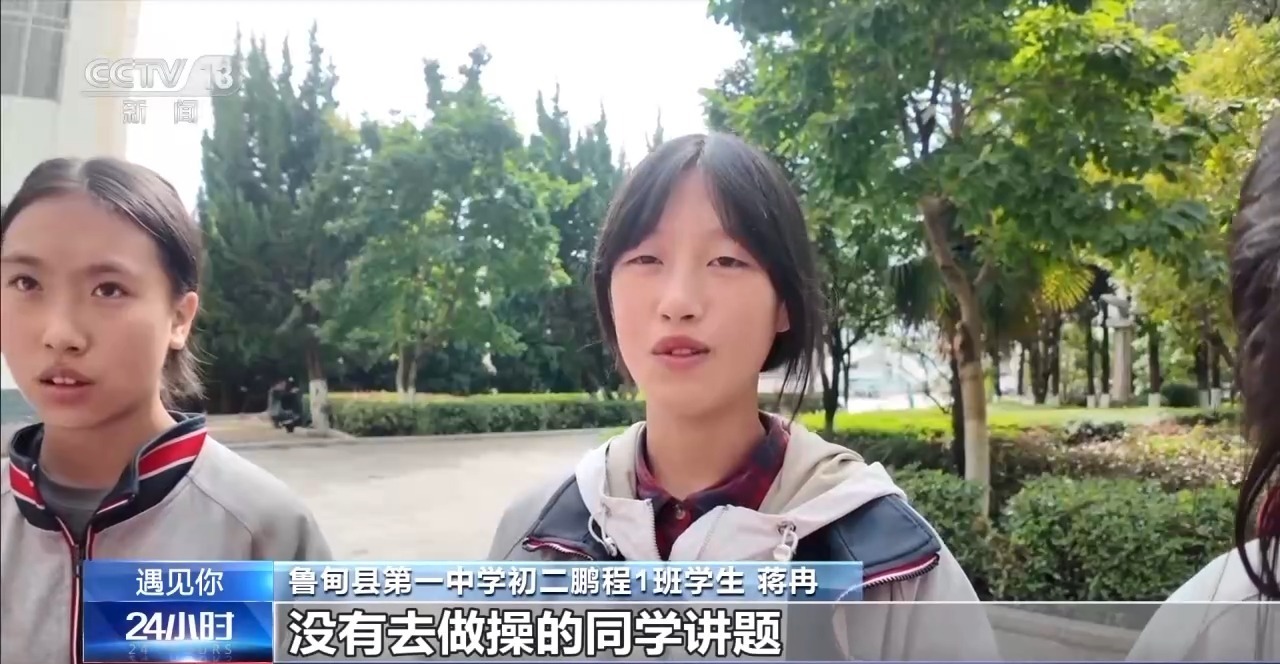 鲁甸县第一中学初二鹏程1班学生 蒋冉:他会帮在学校里面没有去做操的同学讲题,还会帮他周围的同学,比如他的同桌整理桌面。