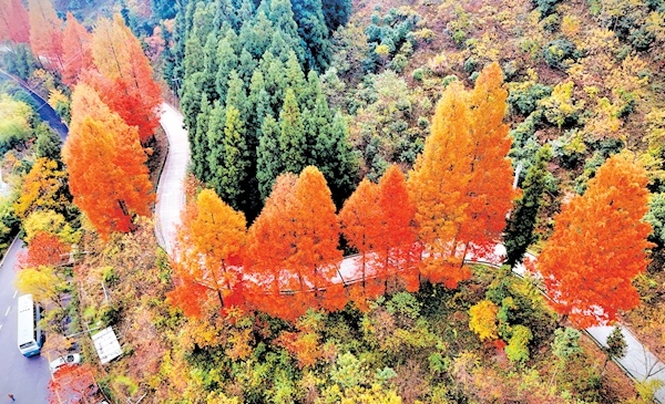 若说城区道路两侧的景致是精心雕琢的“盆景”,那么湖北赛武当国家级自然保护区管理局辖内小川村村道两侧的水杉林便是浑然天成的原生态画卷。整齐排列的水杉树,此时披上了深沉的赭红色,与清澈的溪流、错落的田舍共同绘就一幅静谧的田园诗画。