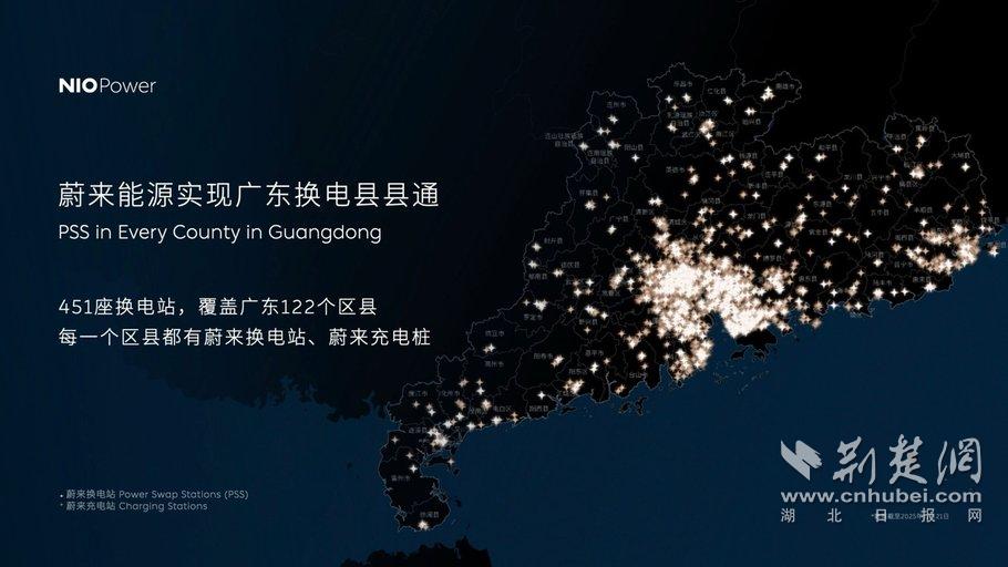在广东省,蔚来已建成451座换电站、505座充电站、3,622根充电桩,覆盖全省122个区县,在广东省已实现换电县县通。