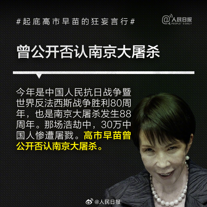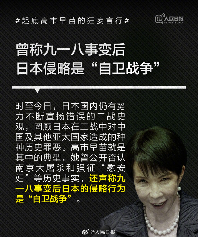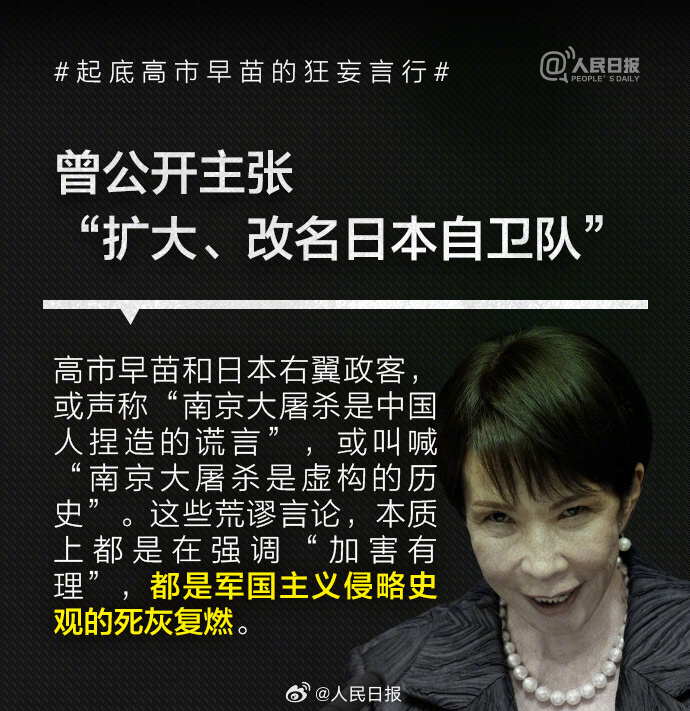1993年高市早苗当选日本国会议员后,公开主张修改日本和平宪法、扩大和改名日本自卫队、参拜靖国神社,其言行与许多臭名昭著的日本右翼政客如出一辙。高市2014年来参拜靖国神社超10次。历史的教训岂敢忘却!我们绝不允许日本军国主义复活,破坏世界和平稳定。