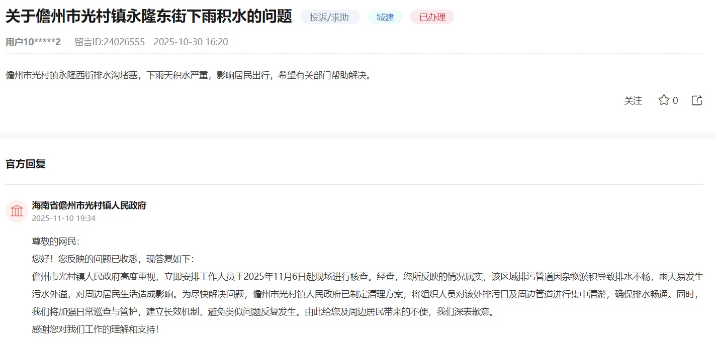 获悉留言后,儋州市光村镇人民政府高度重视,立即安排工作人员赴现场核查。经查,该区域排污管道因杂物淤积导致排水不畅,雨天易发生污水外溢,影响居民生活。对此,光村镇政府已制定清理方案,将组织人员对该处排污口及周边管道进行集中清淤,确保排水畅通。同时,将加强日常巡查与管护,建立长效机制,避免问题反复发生,为居民营造整洁舒适的居住环境。【查看留言】