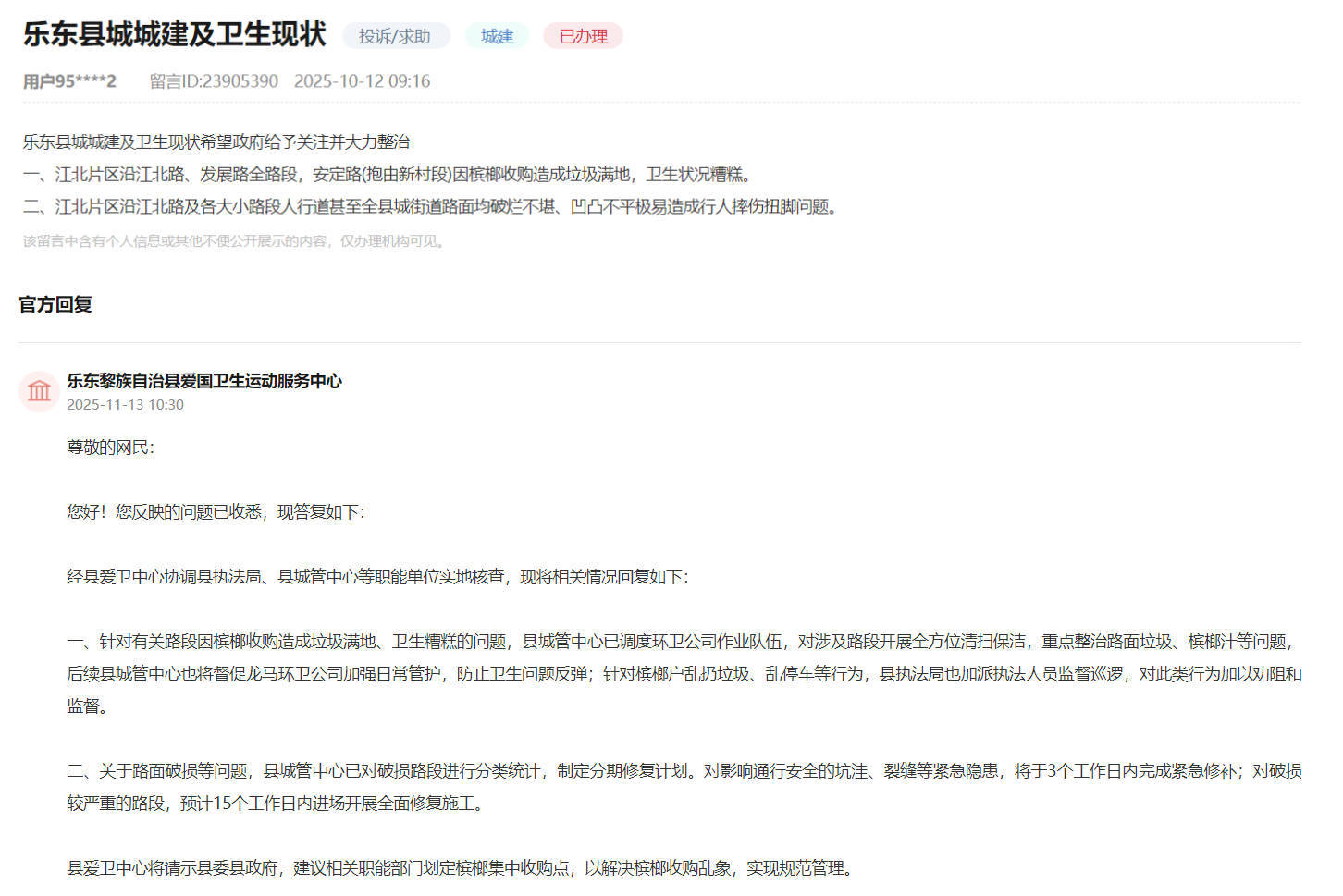 收到留言后,乐东黎族自治县爱国卫生运动服务中心协调县执法局、县城管中心等单位实地核查并推动整改。据悉,针对有关路段卫生问题,县城管中心已调度环卫队伍对相关路段开展全面清扫,重点整治路面垃圾与槟榔汁污渍,并加强日常管护,防止卫生问题反弹,县执法局也加派人员巡逻,劝阻和监督乱槟榔户乱扔垃圾、乱停车等行为;关于路面破损问题,县城管中心已分类统计破损路段并制定分期修复计划,对存在通行安全隐患的坑洼、裂缝路段将于3个工作日内完成紧急修补,对破损严重路段预计15个工作日内进场开展全面修复施工。此外,县爱卫中心还将建议划定槟榔集中收购点,以解决槟榔收购乱象,实现规范管理。【查看留言】