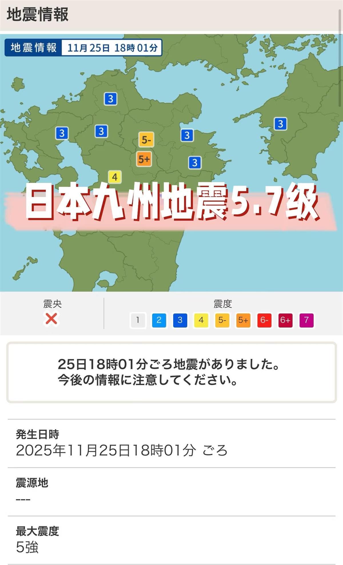 北京时间11月25日17时35分,中国驻福冈总领事馆发文提醒领区中国公民注意防范地震灾害,据日本气象厅发布,日本时间11月25日18时01分左右,熊本县阿苏地区发生里氏5.7级地震,震源深度为10千米,九州各地均有不同程度震感,此次地震未引发海啸。