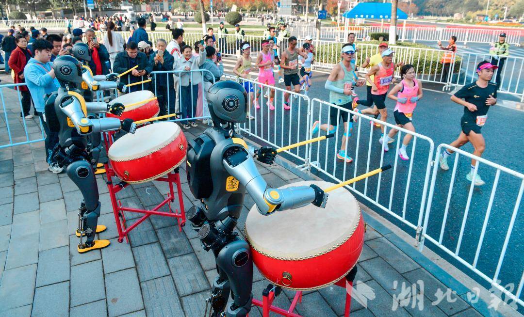 2025光谷马拉松,人形机器人为跑者击鼓助威。