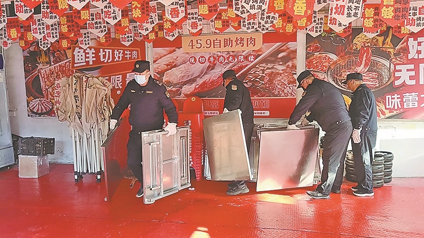 当天,执法队员共计拆除违规设置的20余顶红棚子,拆除固定伸缩棚10余处,清理50余家店面乱堆放杂物,移动招牌30余处。