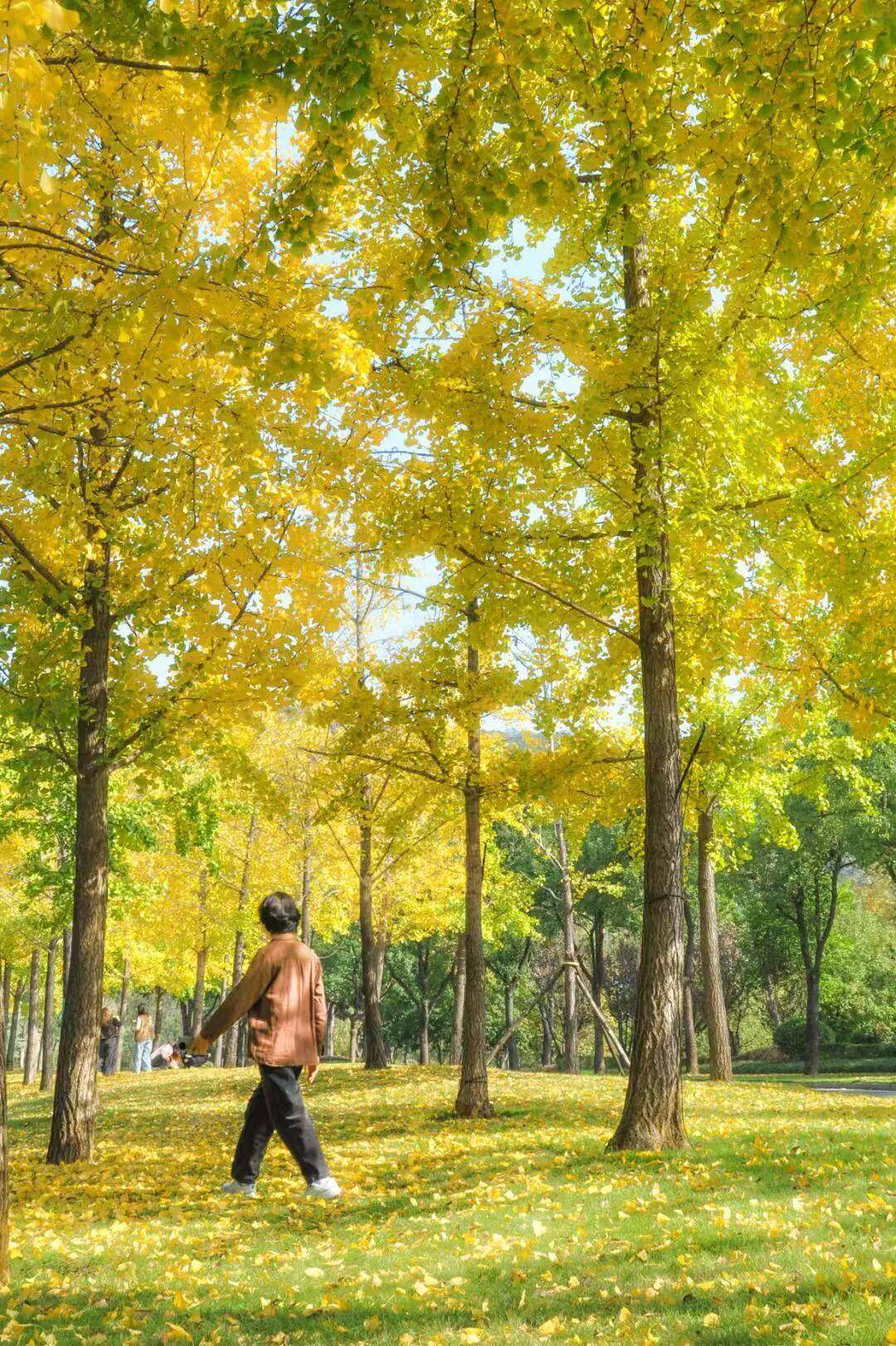 光谷,市民在满是落叶的银杏林漫步(图片源自武汉城管公众号)