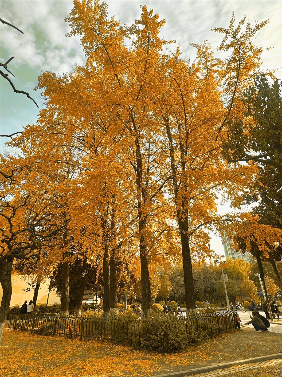 园内18株银杏树树龄超30年,或三五成丛依偎在绿地间,或孤植于拱桥旁,金黄落叶铺在地面,像撒了一层碎金。市民在此跳舞、拍照、闲坐聊天,脚踩落叶的“沙沙”声里,满是城市角落的惬意与温馨,初冬的清冷也被这份热闹与暖意悄悄融化。