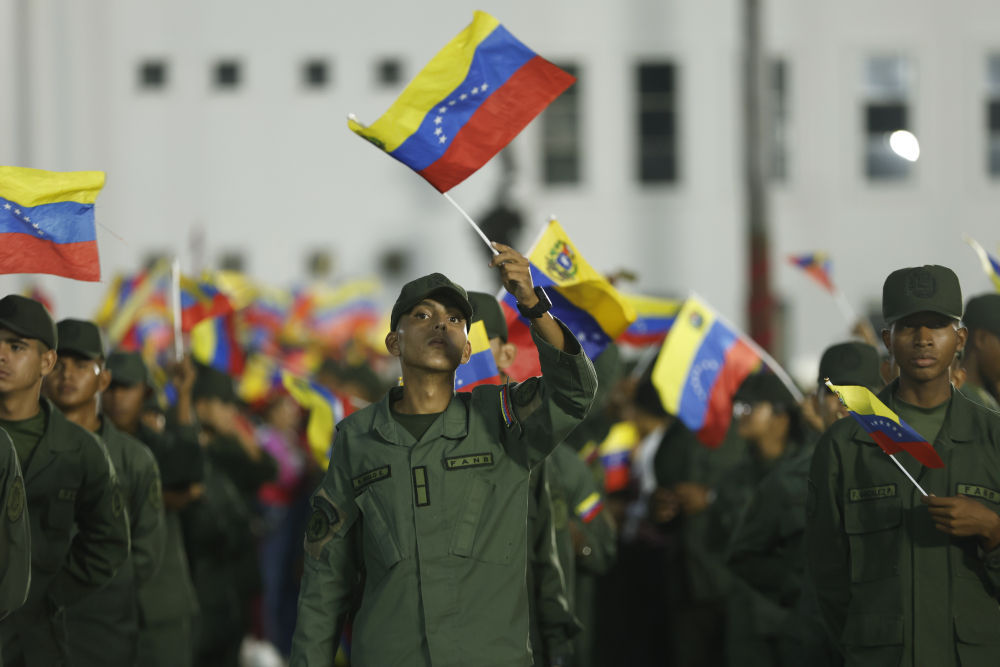 11月25日,委内瑞拉玻利瓦尔国民武装部队成员参加在加拉加斯举行的游行活动。新华社发