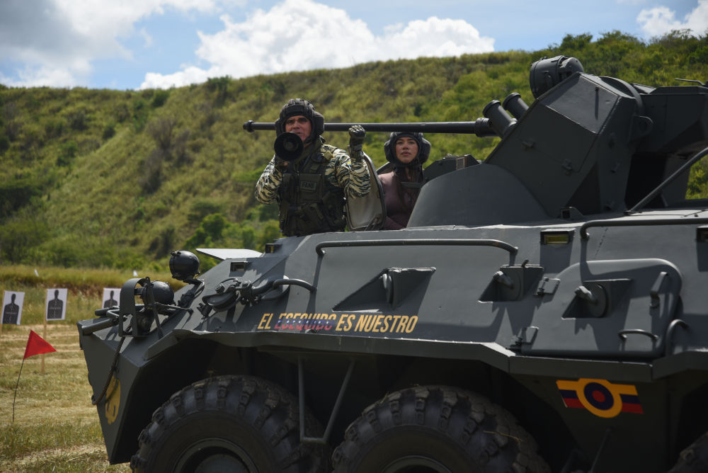 2025年9月13日,委内瑞拉国防部长帕德里诺·洛佩斯(左)在位于首都加拉加斯的蒂乌纳堡陆军基地视察民兵训练。新华社发(萨尔戈多摄)