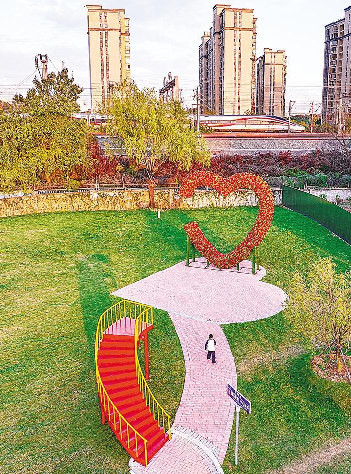11月13日,建成开放的武汉火车站爱尚洪山体育游园内,登上观景楼梯,能定格与“复兴号”合影。 (湖北日报全媒记者 朱熙勇 摄)