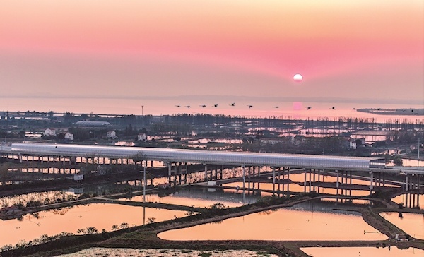 11月21日,夕阳西下,许多候鸟从武汉市双柳长江大桥主桥北端全封闭式声屏障上空飞过。双柳长江大桥是国家高速公路网武汉都市圈环线的重要组成部分。该桥沿线毗邻涨渡湖湿地保护区,有200多种、数万只鸟儿在保护区栖息繁衍。这座全封闭式声屏障长400米、高6.38米、横跨34米,有效降低对周边野生动物,特别是对声音敏感的鸟类的惊扰。楚天都市报极目新闻记者朱熙勇摄