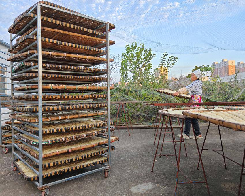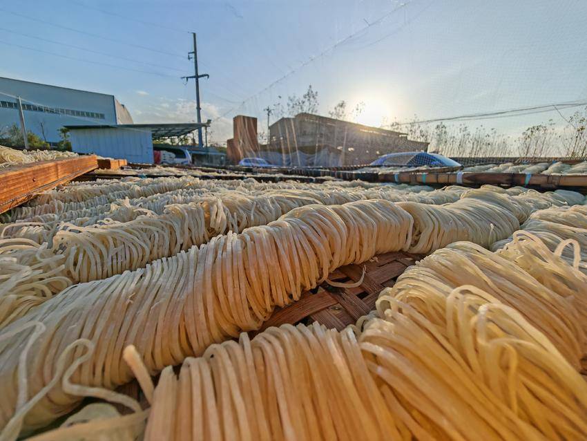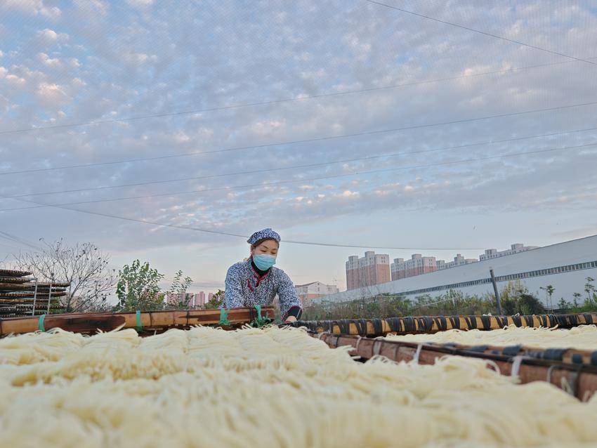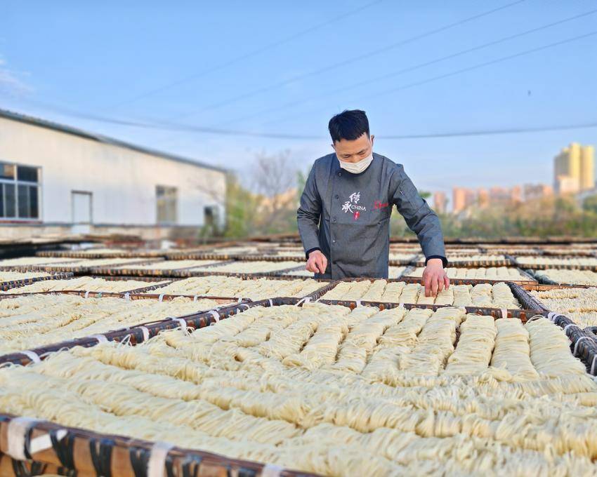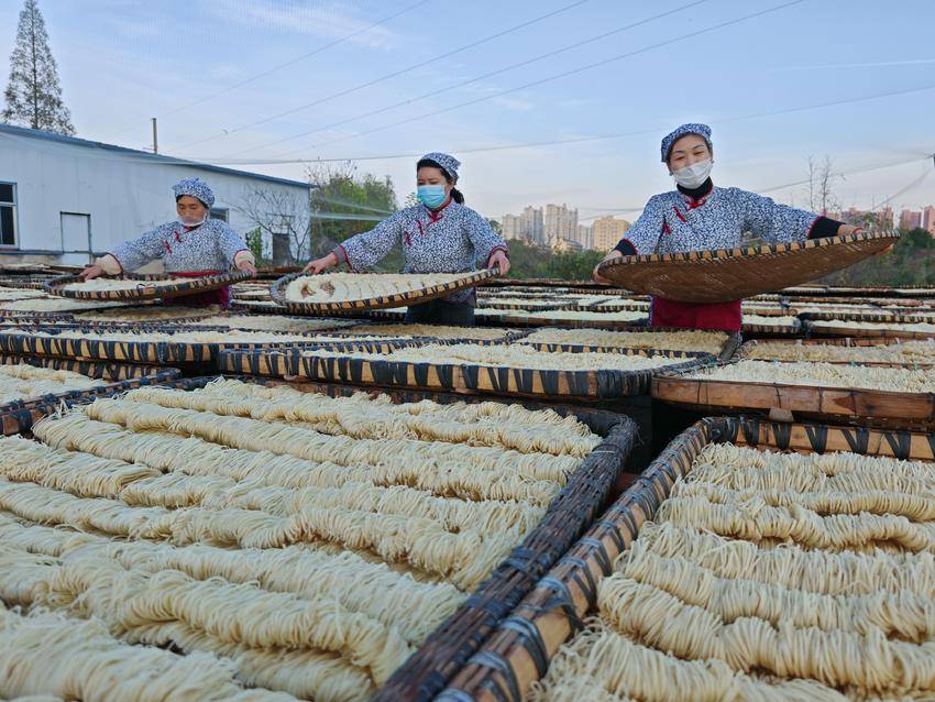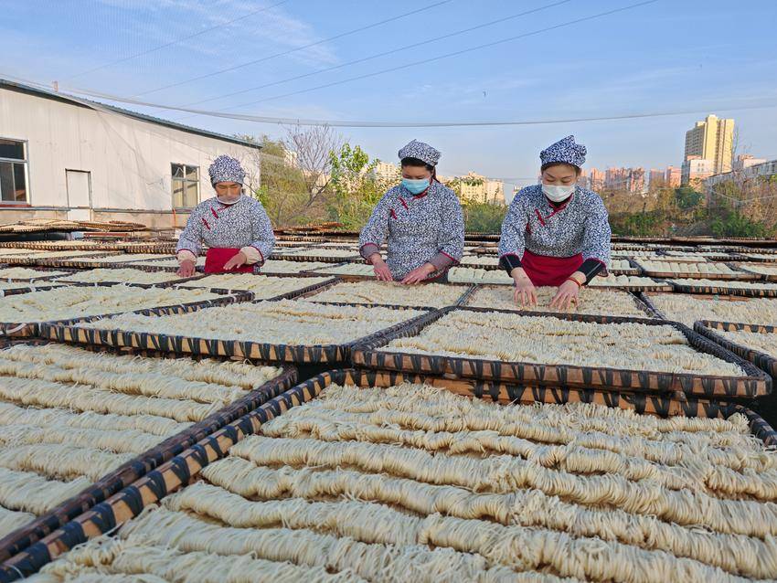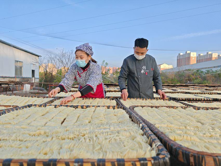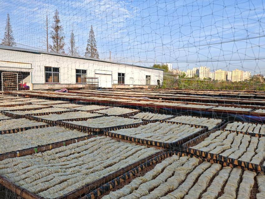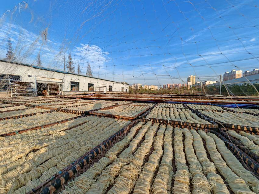11月26日,云梦县城关镇黄湖社区,黄湖吴家鱼面厂内工人正晾晒“云梦鱼面”。冬日暖阳为生产提供绝佳条件,云梦云梦生产各厂家抢抓时机,为元旦、春节市场备货。