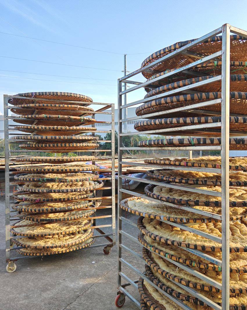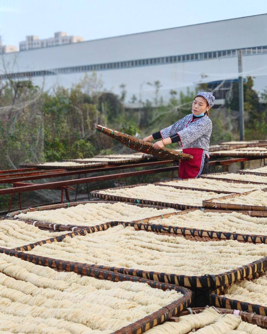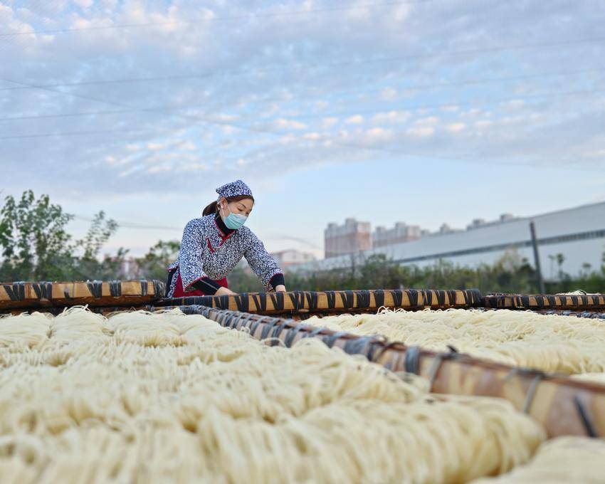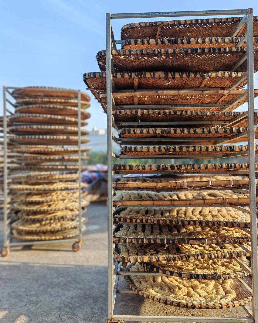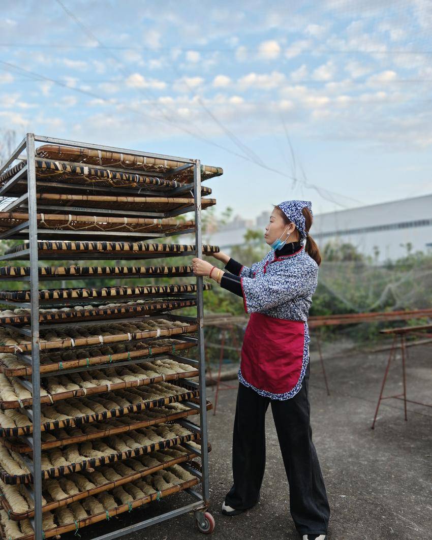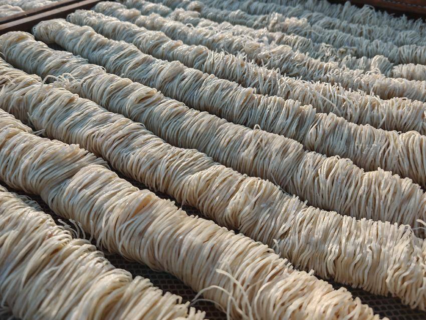 11月26日,云梦县城关镇黄湖社区,黄湖吴家鱼面厂内工人正晾晒“云梦鱼面”。冬日暖阳为生产提供绝佳条件,云梦云梦生产各厂家抢抓时机,为元旦、春节市场备货。