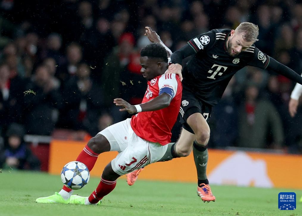 11月26日,阿森纳队球员萨卡(上)与拜仁慕尼黑队球员凯恩拼抢。