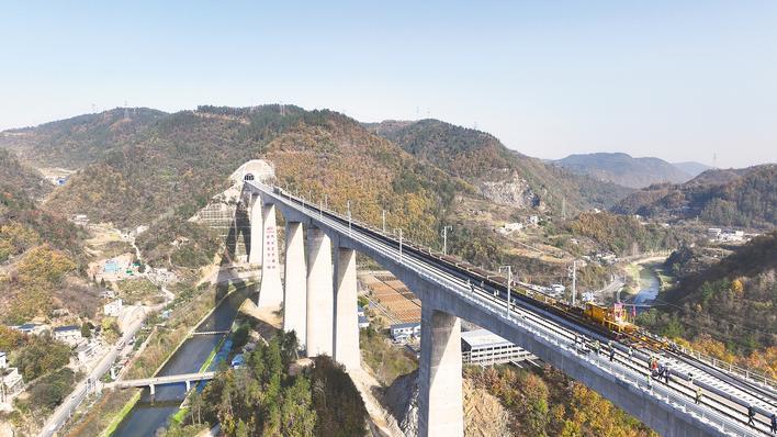 西十高铁穿越秦岭山脉,桥隧比高达95%,涉及长大坡道铺轨地段14处。自今年9月8日全线铺轨启动以来,建设单位组织施工单位优化施工工艺,统筹资源配置,克服线路连续穿越密集长大坡道群、22.9公里的全国铁路最长单洞单线隧道狭小空间铺轨等复杂工况。为确保铺轨施工安全有序,施工单位创新采用大功率履带式牵引车配合重型铺轨设备,并辅以连续性排风排烟的组合方案,创下单日最高铺轨10公里、日均铺轨6公里的高效进度。此次铺轨贯通点位于中铁十一局集团担负施工的西十高铁神定河特大桥上。该桥全长841.05米,桥墩最高达108米,为西十高铁全线墩高最高的大跨度连续结构特大桥。