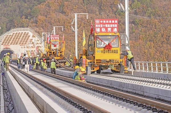 11月27日,随着最后一对500米长钢轨在西十高铁(西安至十堰)湖北段神定河特大桥上平稳铺设就位,西十高铁全线铺轨完成。这标志着汉十高铁(武汉至十堰)和西十高铁成功“牵手”,为武(汉)西(安)高铁如期建成通车奠定坚实基础。西十高铁开通后,西安至十堰实现1小时内到达,武汉至西安的铁路运行时间将由目前的5小时缩短至2.5小时左右。 楚天都市报极目新闻记者李辉摄
