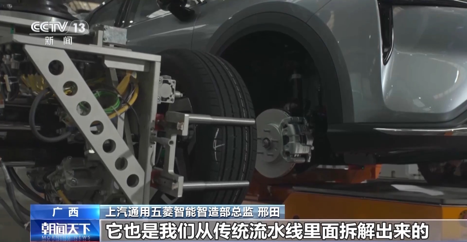 上汽通用五菱智能智造部总监 邢田:这边就是我们的轮胎岛,它是我们从传统流水线里面拆解出来的,根据产能需求,可以两条线同时开,也可以只开一个,可以实现产能的自由伸缩。