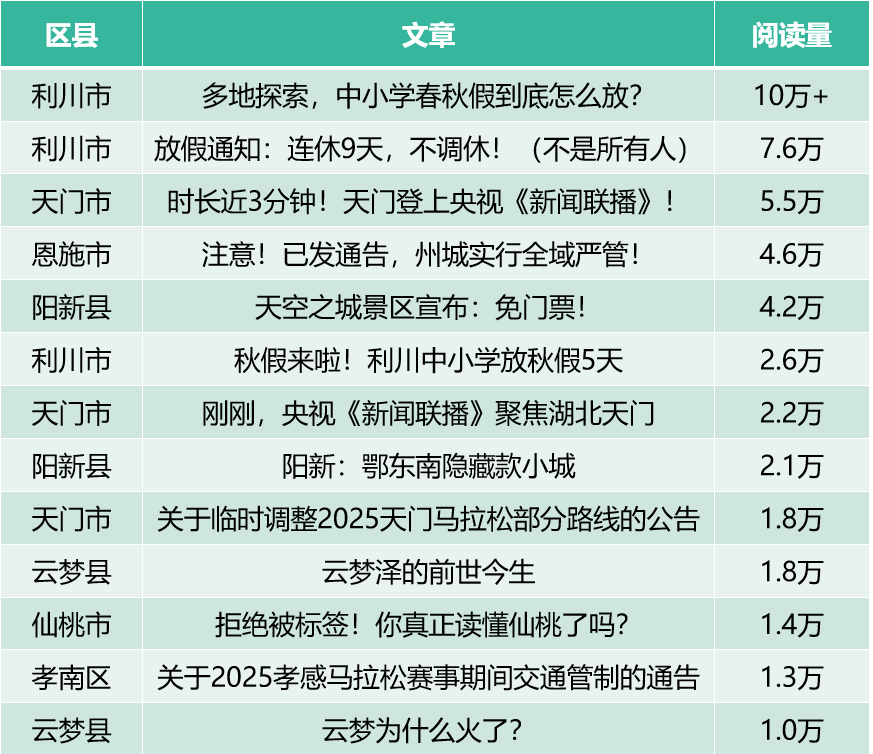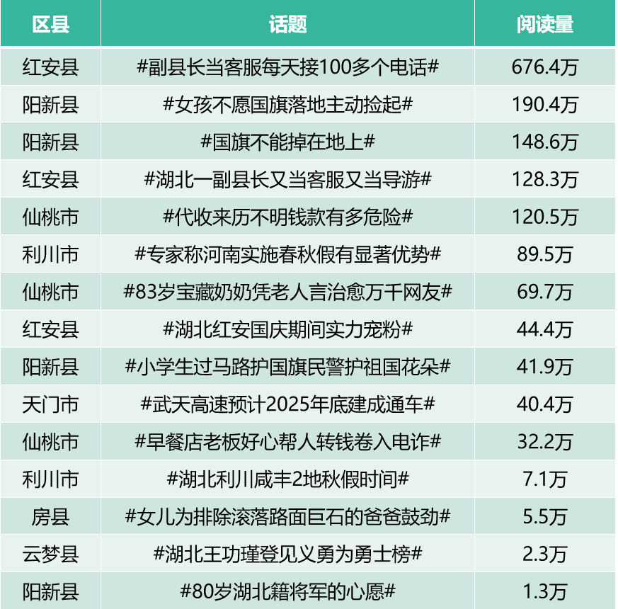 从媒体报道情况来看,天门、恩施、云梦、阳新、潜江等地信息数量遥遥领先,唱响湖北区县高质量发展主旋律。从微博平台热门话题来看,相关话题涵盖文旅服务、民生安全、教育改革、交通基建、社会正能量等方面。从微信平台热门文章来看,主要关注教育、文旅创新、城市发展、公共管理等领域。相关文章勾勒出湖北各区县主动作为、锐意创新的生动图景,充分彰显了各地在文明进步与和谐发展中的显著成效,为县域高质量发展注入了强劲的舆论动能与精神力量。