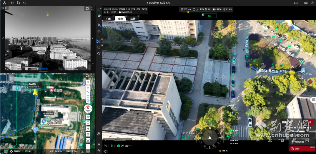 荆楚网(湖北日报网)讯(记者齐一璇 通讯员余雨龙)近日,在武汉交通职业学院尚能楼楼顶,一架无人机从自动打开的浅灰色方形机巢中平稳起飞。随后,这台无人机开始对校园及周边区域展开自主巡检,任务完成后,精准返回“巢”内。