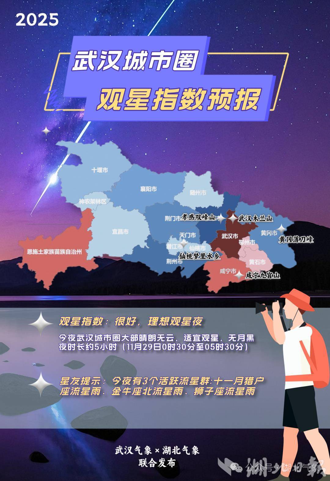 预计双休日全省仍以晴到多云天气为主,适宜户外赏秋,但昼夜温差较大,需适时增减衣物。28日夜间到29日早晨,省内局地有雾,公众需留意最新预警预报信息。周日受新一股弱冷空气影响,省内将出现4到6级偏北阵风,气温略有下降。28日夜武汉城市圈大部晴朗无云,利于观星活动,无月黑夜时长约5小时(29日0时30分至5时30分),共有三个活跃流星群,11月猎户座流星雨、金牛座北流星雨、狮子座流星雨。