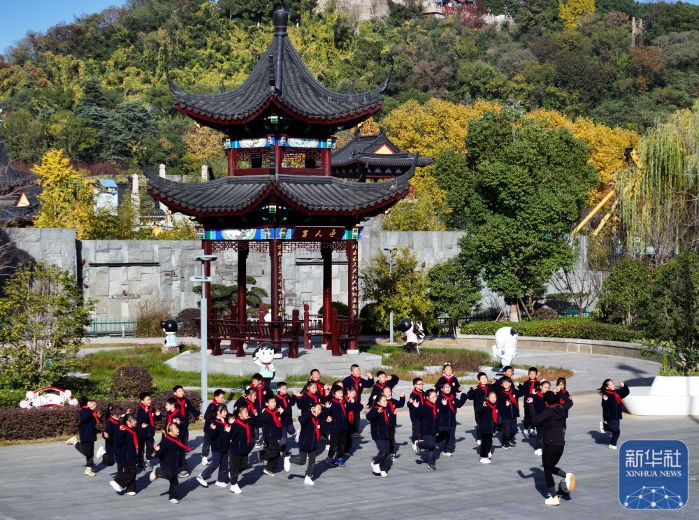 ↑ 11月28日,在位于南京市鼓楼区的天妃宫小学,学生在上体育舞蹈课(无人机照片)。