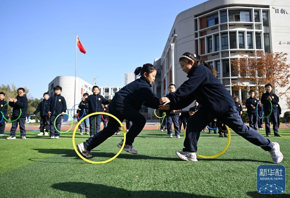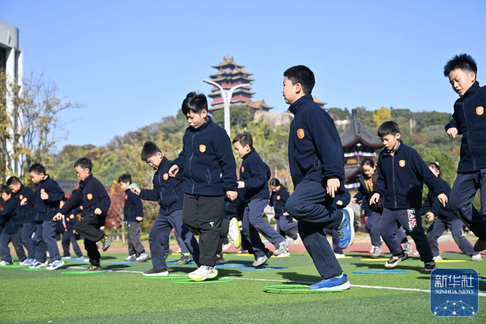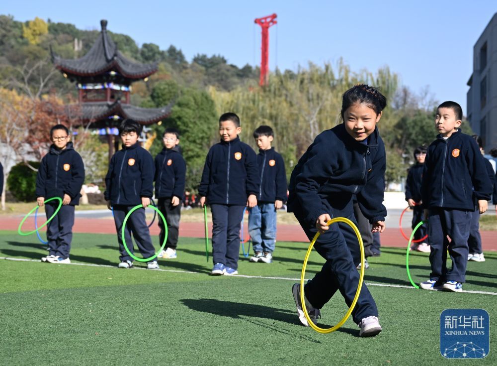 ↑ 11月28日,在位于南京市鼓楼区的天妃宫小学,学生在上体适能课。