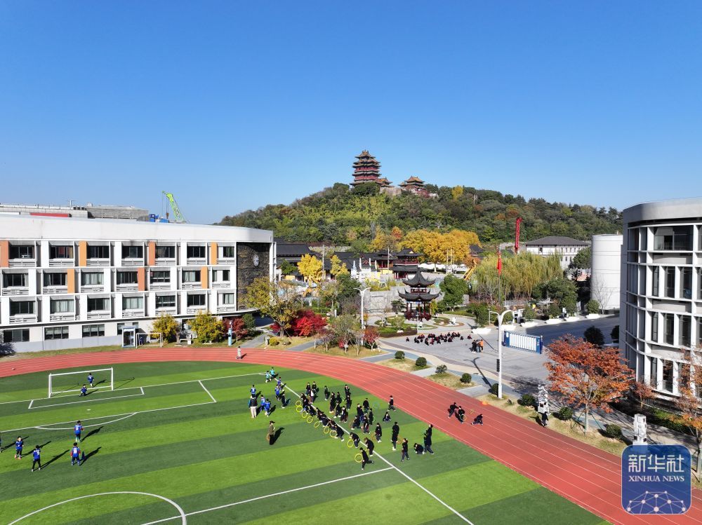 ↑ 11月28日,在位于南京市鼓楼区的天妃宫小学,学生在操场上运动(无人机照片)。