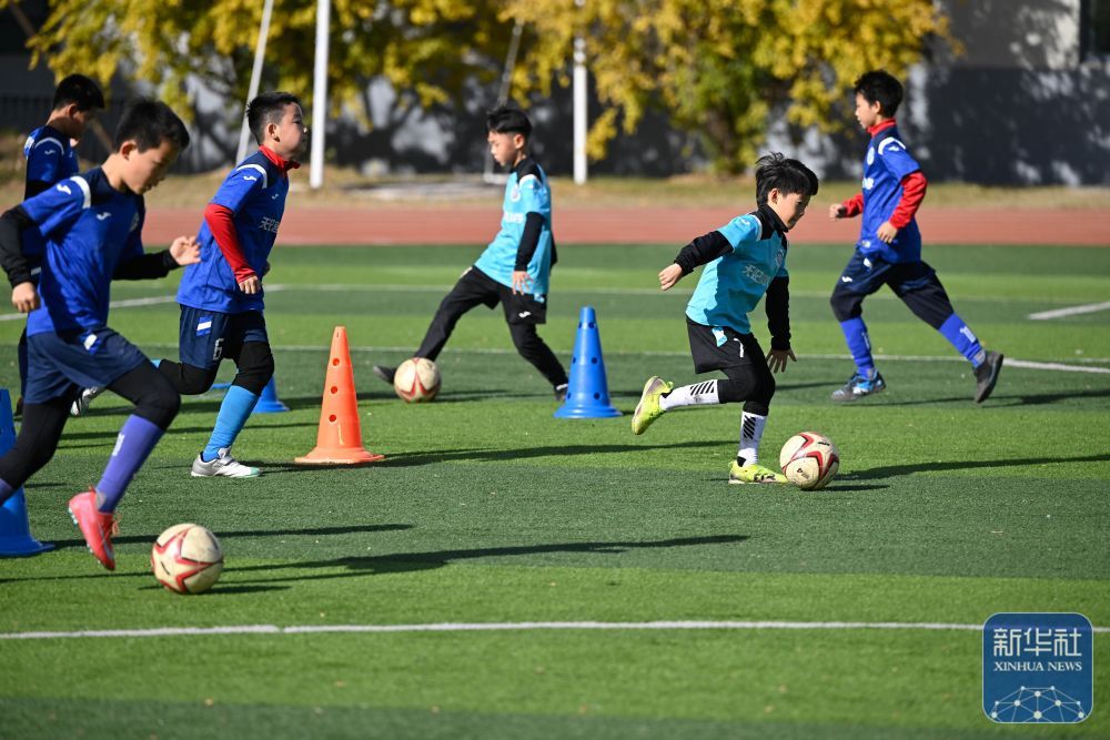 ↑ 11月28日,在位于南京市鼓楼区的天妃宫小学,足球社团的学生在训练。