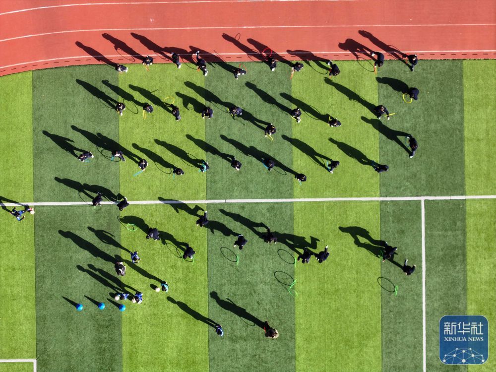 ↑ 11月28日,在位于南京市鼓楼区的天妃宫小学,学生在上体适能课(无人机照片)。