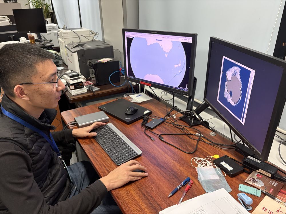 船时11月29日深夜,随船卫星保障人员、国家卫星海洋应用中心工程师纪元在电脑前接收中国“1米C-SAR卫星01”与“02星”数据,第一时间处理转化,并最终形成高分辨率卫星数据图片。