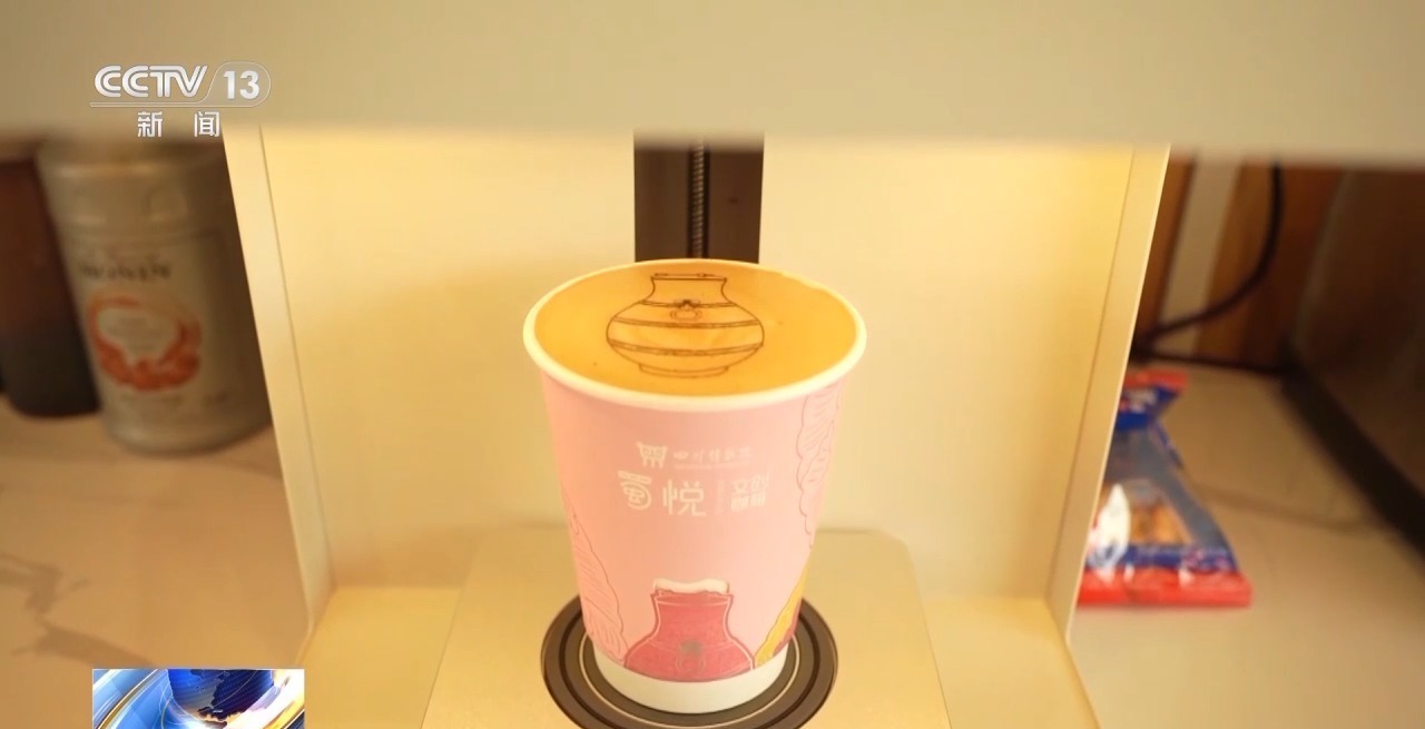 总台记者 曾献钰:这杯咖啡就是来自川博的“盲盒咖啡”,而今天我开出了拉花纹样,就是来自战国时期的水陆攻战纹铜壶。
