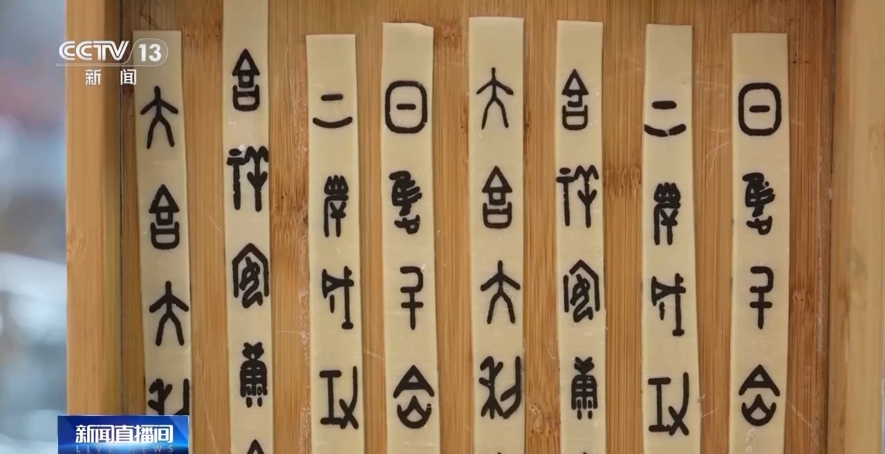 殷墟博物馆子飨餐厅负责人 马豪:面条做成会压印,压完之后会人工往上刷墨鱼汁。我们选用的是四个不同的甲骨文字(词句),分别是大吉大利、吉祥安康、上岸成功和日进斗金,这样满足不同客群的不同的需要。